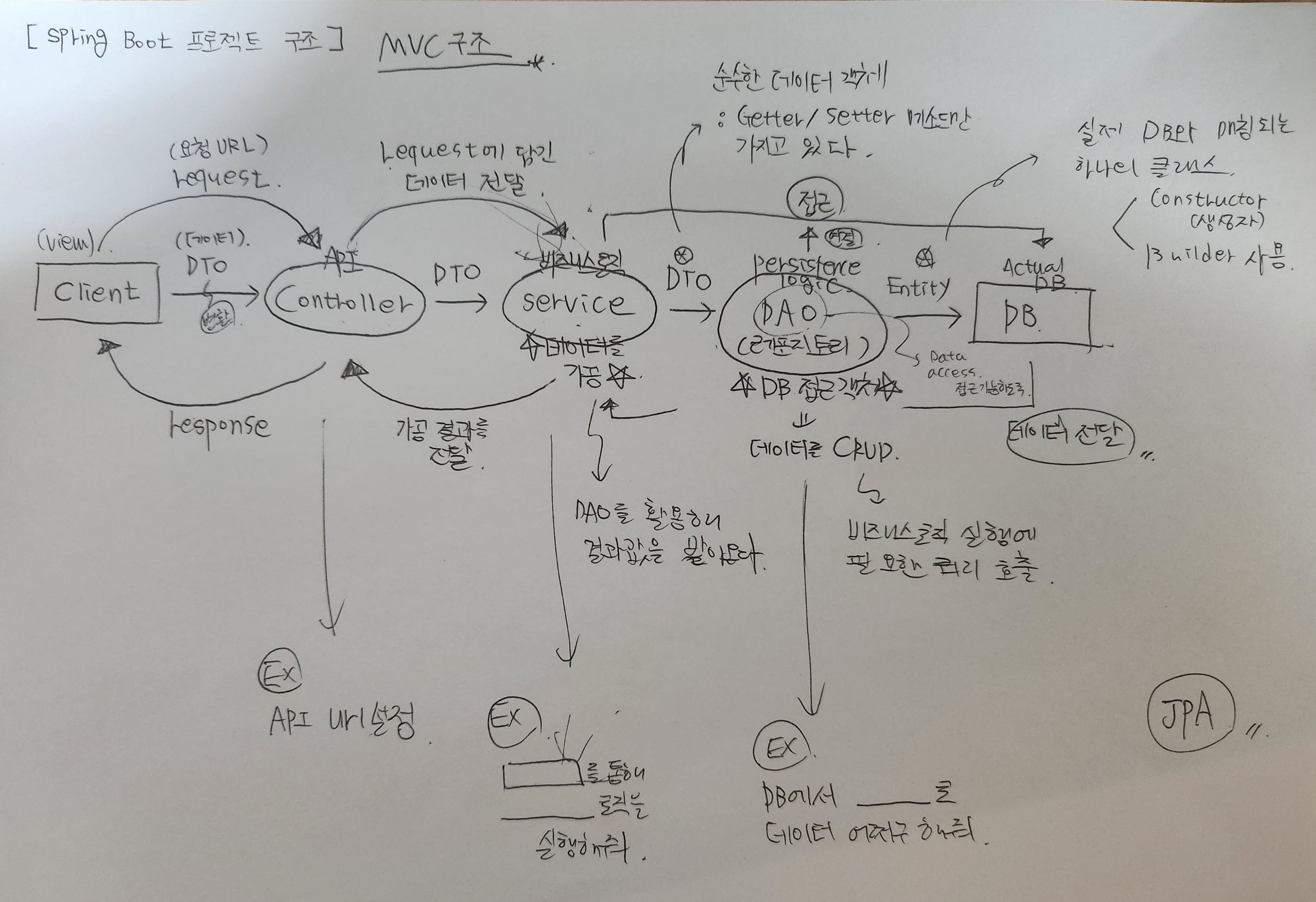 Spring Boot MVC의 기본 구조Spring Boot의 MVC 구조는 클라이언트 요청을 처리하는 데 있어서 Model-View-Controller (MVC) 패턴을 따르는 아키텍처이다.Client -> Controller -> Service -> DAO (Repository) -> DB ** 그림을 그리거나 글씨로 써야 공부가 되는 편이라 ... 그런데 막 쓰면서 하느라 글씨체가 ... 😂** 인턴하면서 모은 돈으로 꼭 아이패드 사야지 ㅎㅎ ** 사실 종이에 써야 공부가 더 잘되지만, 대중교통을 타고 있을 때는 불편해서 ㅠㅠ 아이패드 같은 기기가 꼭 필요하다 🥲 데보션영에서 진행하는 프로젝트를 하면서 스프링부트로 개발하게 되었는데, 처음 해보는 프레임워크라,,, 공부가 필요했다.이건 한 3..